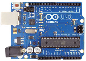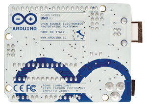 Arduino Uno Rev3 è una scheda elettronica basata sul microcontrollore Atmega328 (datasheet). Dispone di 14 ingressi/uscite digitali (di cui 6 possono essere utilizzate come uscite PWM), 6 ingressi analogici, un cristallo oscillatore a 16 MHz, una connessione USB, un jack di alimentazione, un header ICSP e un pulsante di reset.