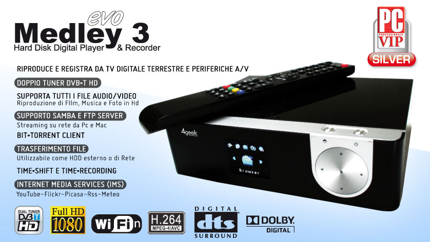 AL MOMENTO ARTICOLO NON DISPONIBILE. POSSIBILE NUOVA PRODUZIONE PER APRILE. SEGUITECI PER AGGIORNAMENTI. Medley 3 EVO e' un prodotto All in One che ti permettera' di compiere numerose operazioni con un solo dispositivo. In questo modo potrai sbarazzarti di tutti i lettori, decoder e hard disk multimediali che hai posizionato accanto alla tua nuova TV HD, ed abbinarci un solo elegantissimo ''scatolotto'' per: - Vedere e registrare i tuoi programmi preferiti dai canali in chiaro del Digitale Terrestre Integrato DVB-T! - Registrare i tuoi programmi preferiti (momentaneamente), le partite di calcio che non vorresti perdere, documentari per ricerce scolastiche e tutto cio' che vorrai, con un semplice tasto e comodamente, grazie alla funzione TIMESHIFT che ti permettera' di mettere in pausa la visualizzazione del programma durante l'acquisizione, continuando, pero', a registrarlo (momentaneamente e fino a 4 ore) per poterlo poi guardare con tutta tranquillita' - Registrare un programma che e' in onda su un canale mentre se ne guarda un altro in onda su un altro canale, grazie al doppio tuner - Convertire e registrare su hard disk i filmini dei tuoi piccoli, i video importanti e tutti i tuoi ricordi registrati su supporti VHS, DVD, DivX o direttamente da telecamera analogica o digitale - Riprodurre tutti i video che vuoi, in formato DivX & XviD (anche in HD), MPEG-4, VOB, MKV, H264, IFO, ISO (anche BLU-RAY) e molti altri, in alta definizione fino a 1080p, grazie all'uscita HDMI - Condividere i contenuti delle periferiche di archiviazione di massa e PC collegati, tramite rete locale LAN o Wi-Fi: eviterai cosi' di masterizzare i film scaricati da internet: li potrai guardare direttamente sulla TV! - Immagazzinare tutti i dati che vorrai, installando un Hard Disk Interno Serial ATA - Visualizzare anche immagini in formato jpeg, bmp e gif, trasformando la tua TV in una vera a propria cornice digitale! - Ascoltare la tua musica preferita da TV, impianto Hi Fi o Dolby Surround 5.1 con un'elevatissima qualita' sonora grazie alla doppia uscita audio digitale sia ottica che coassiale! - Intrattenere i tuoi figli durante un lungo viaggio in auto. Grazie alle sue dimensioni molto contenute ed all'entrata per adattatore ad infrarossi, puoi collegare il Medley ad una TV da auto e posizionarlo nel cruscotto della tua auto lasciando fuoriuscire solo il ricevitore ad infrarossi (acquistabile separatamente) per comandare il dispositivo a distanza. Guarda il video! |